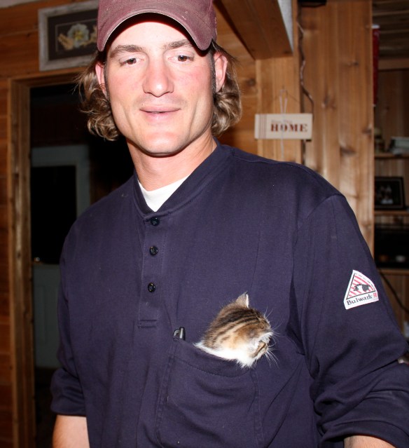 1. That picture of the tiny kitten in your hubby’s pocket is about the cutest thing in the whole wide world. If he or she gets a name, it should be Italian, since the cat likes spaghetti.