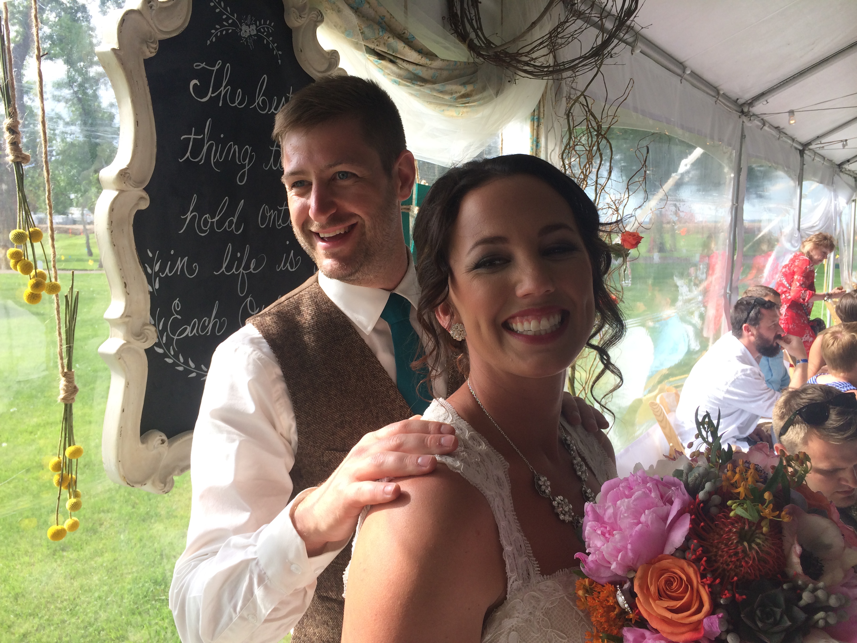 Today we celebrate love. That’s what weddings are about. The joining of two people because they met somewhere, and they clicked, so they went on a date to a movie or for drinks and they hit it off, so they went on another date and another one and then maybe she caught a cold and had to break plans and stay home and he showed up with orange juice, Champaign and chicken noodle soup—and no one had ever done anything like that for her before so she tried to find ways to keep him around, meet his parents, bring him to her family ranch, get him on a horse or two and convince him to start a new life in a wild place.