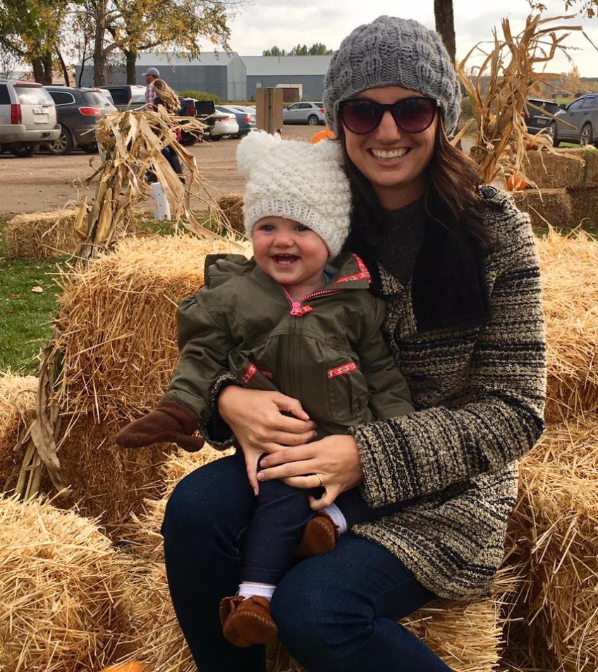 A rainbow baby in a pumpkin patch