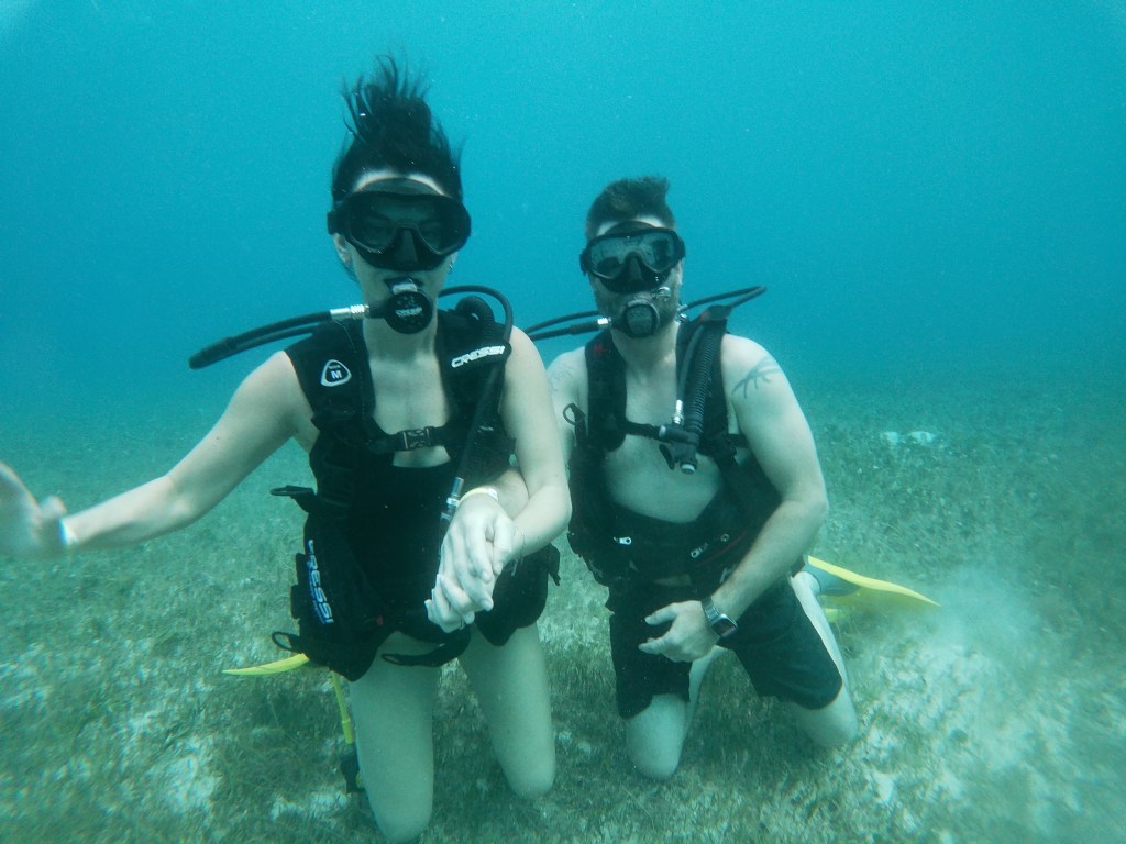Yup. Just give me a 20-minute lesson on land and I’m expert enough to put my face underwater and not panic. And by not panicking I mean managing only to do the one thing required of me to not die while scuba diving and that is to breathe. Need me to actually swim, or push that button that releases air to send me up or down, or look at fish or pose for a picture or not float to the surface and need to be pulled back down? Can’t do it. Working on breathing here.