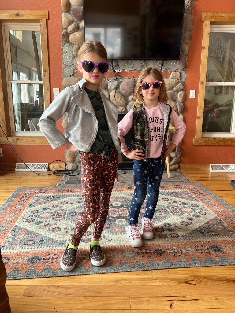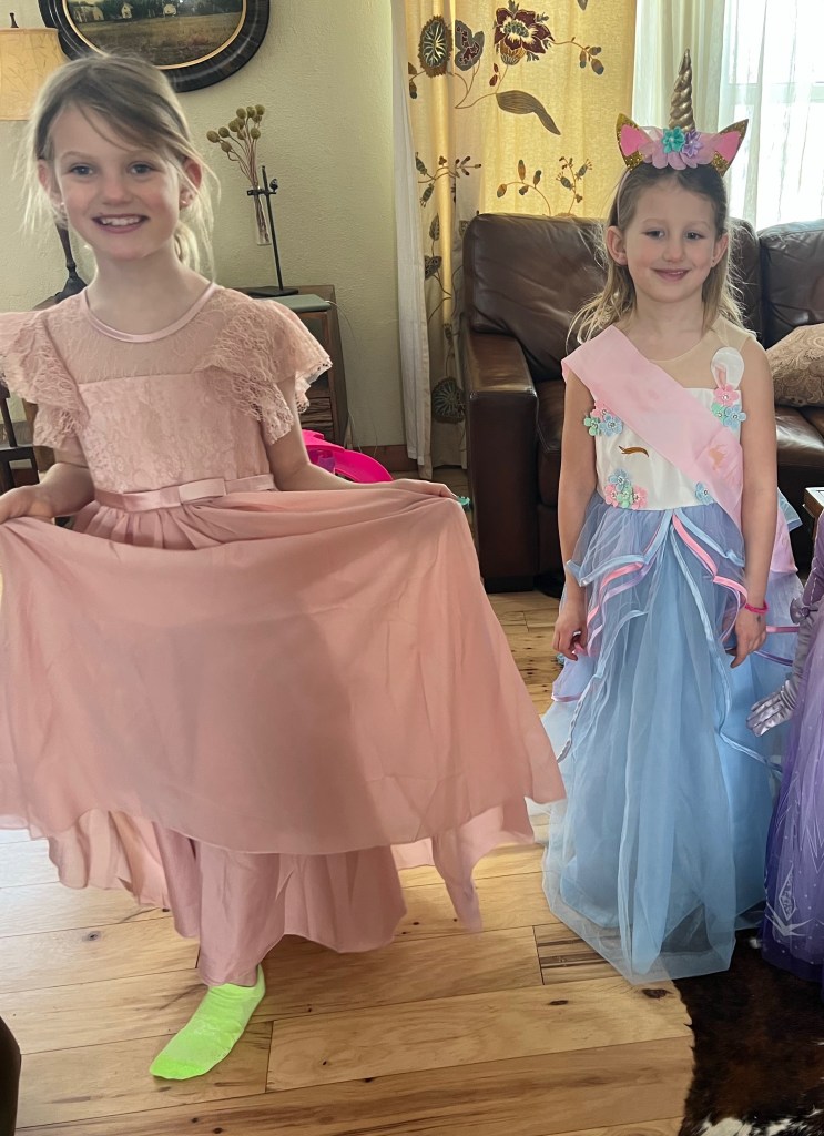 I always like to see the outfits they come up with. Usually it’s a combination of whatever animal print I have within arm’s reach, a flowy skirt that twirls, a jacket, and some high heels. Nothing ever matches. Their dad doesn’t have many fancy options to choose from because once I thought it was a good idea to throw all of his neckties in the washing machine and, as you can imagine, none of them survived, so I always come out as the most overdressed of the two of us.