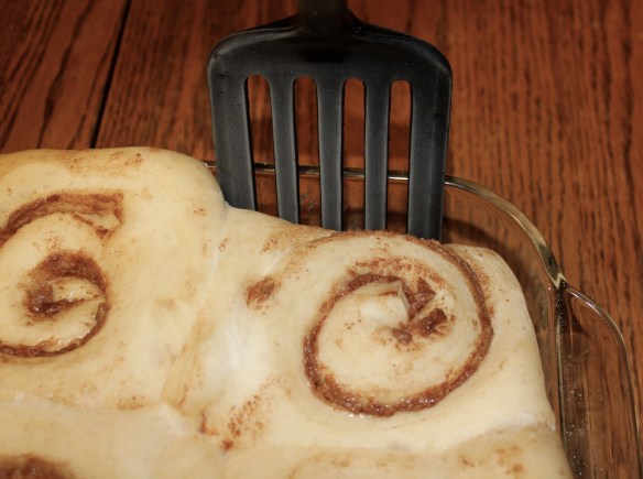 Step 1: Think about breakfast the night before. Take your frozen cinnamon rolls out and place in a greased 9X13 or 8X11 pan.