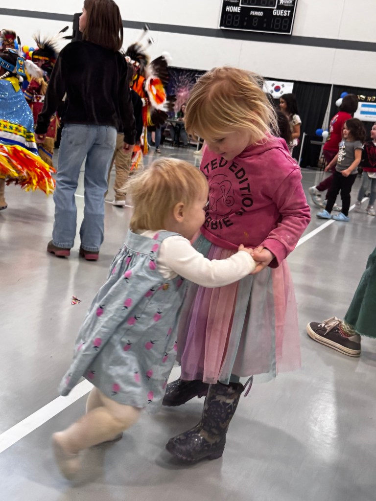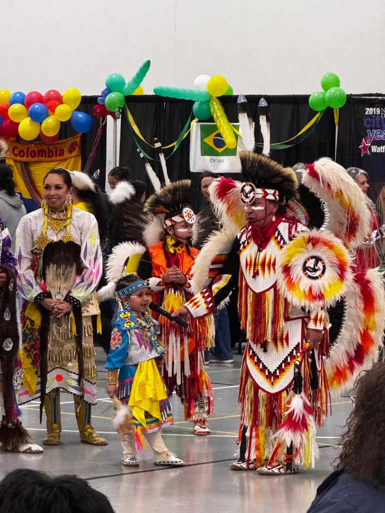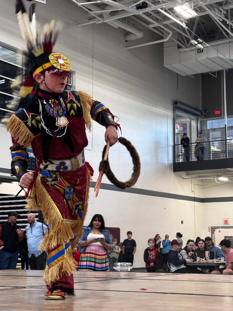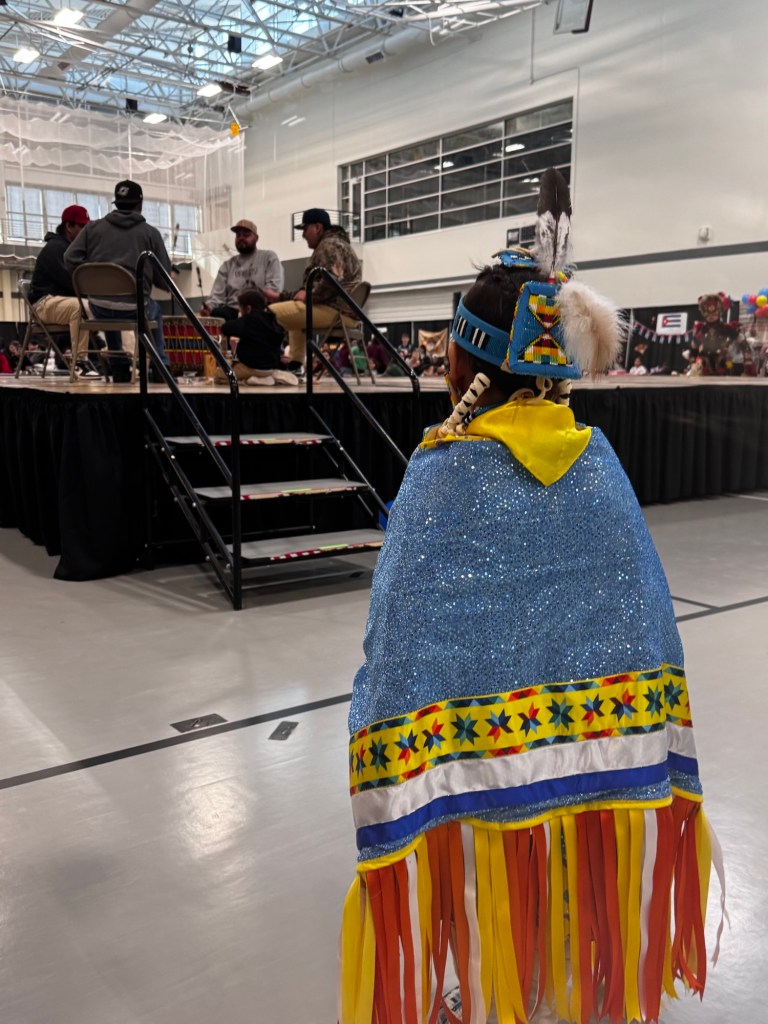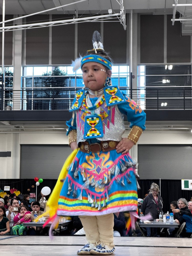 “We invite all of you to dance with us now,” our host’s voice boomed from the speakers. He stood by his grandson who wore a matching headdress, leggings and colors. I grabbed my daughters’ hands and we took him up on his offer. The six-year-old dressed in her pretty fancy dance shawl grabbed my hand and along with a dozen or so others from the crowd, more joining as the drums started, we formed a circle and walked to the beat of the drum.