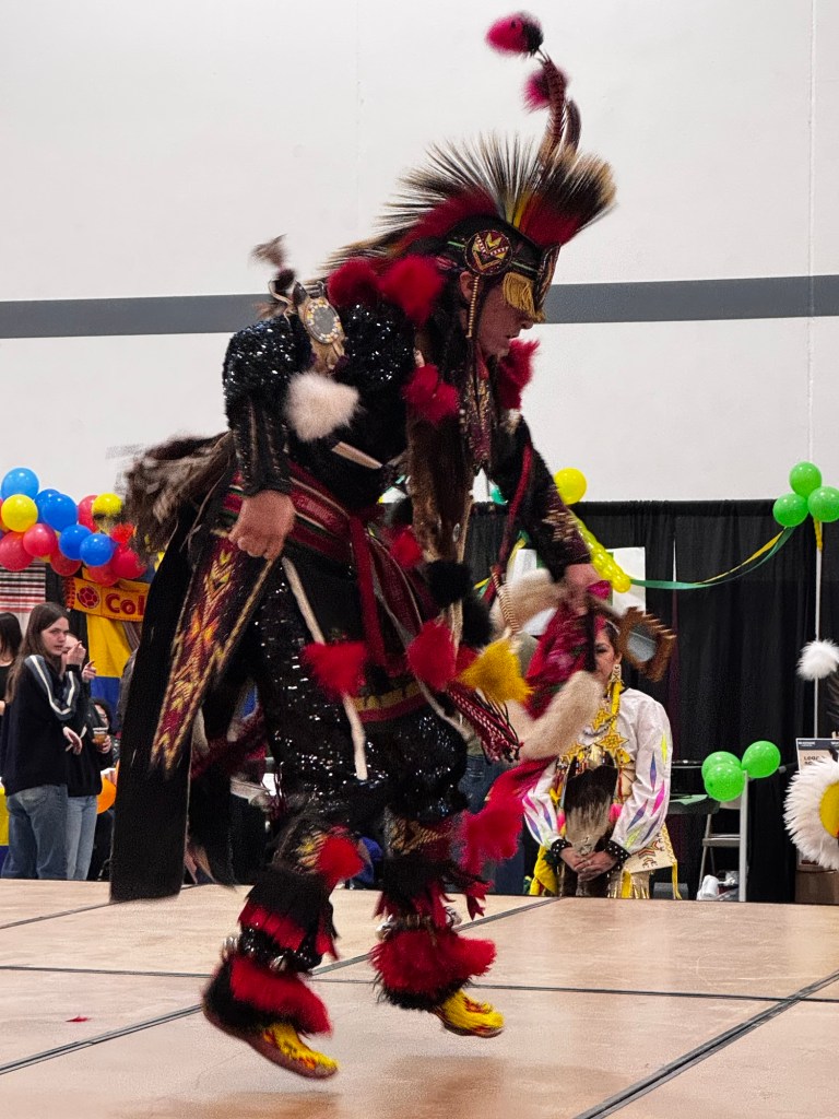 I called the dancers up on stage and they took it from there, welcoming and thanking everyone, introducing the Prairie Chicken Dance and then the Fancy Dance and then the Grass Dance and how Native Americans used to dance to stomp down the tall grass in order to flatten a spot for their teepees. You can only imagine a world like this in history books and movies now, unless you get the privilege of hearing that history flow through the drum beats of men in Nike sneakers and hoodies, or watch it move through the body of a twelve year old boy in traditional dress and moccasins, lifting and sweeping his legs over the imagined grass on the center of the stage.
